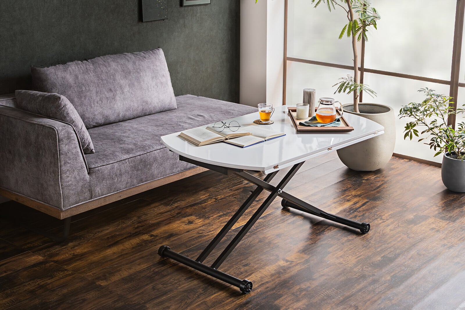 低くしてリビングテーブルとして置き、来客の際に広げたり